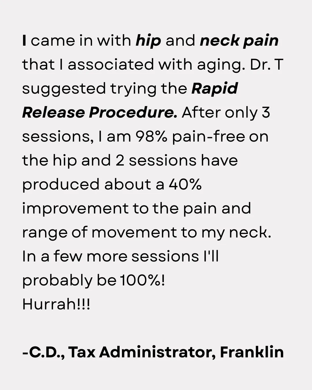 Whether it's back pain, neck tension, knee trouble, or shoulder discomfort - you don’t have to live with it. Our goal is to help you reduce pain, move better, and return to what you love.